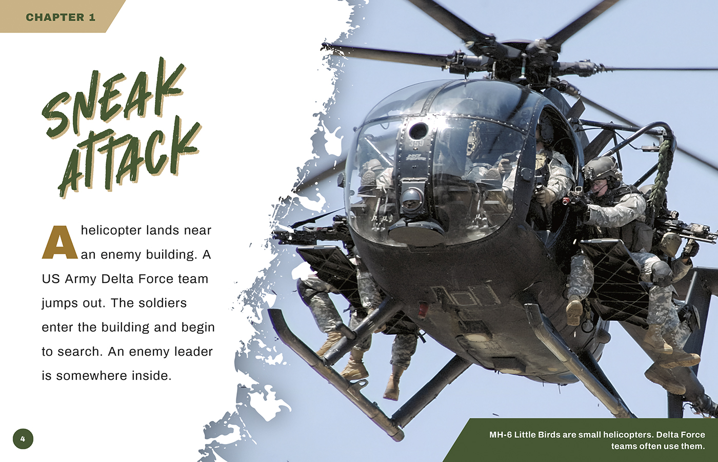 This book gives an exciting overview of the Delta Force, from when the force first formed to its tasks, training, and missions today. Short paragraphs of easy-to-read text are paired with plenty of photos to make reading engaging and accessible. The book also includes a table of contents, fun facts, sidebars, comprehension questions, a glossary, an index, and a list of resources for further reading. Apex books have low reading levels (grades 2-3) but are designed for older students, with interest levels of grades 3-7.