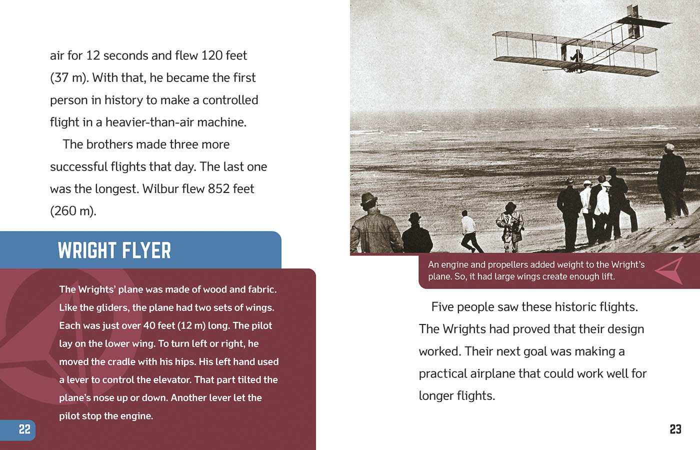 This informative title explores the history leading up to the Wright brothers taking flight, the significance of this milestone, and how this milestone changed the United States. A special feature delves into a primary source from this time period. The book also includes several informative sidebars, a table of contents, a reading comprehension quiz, a glossary, additional resources, and an index. This Focus Readers book is at the Navigator level, aligned to reading levels of grades 3–5 and interest levels of grades 4–7.